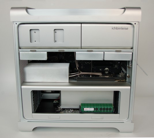 Unweit von Stuttgart befindet sich der Firmensitz von MR Computertechnik oder viel besser bekannt als „ichbinleise.de“, die eine akustische Optimierung des Apple Mac Pro anbietet. Mit der lustigen Produktbezeichnung Granny Smith in der Version RSL wird ein komplett lüfterloser Umbau des professionellen Apple-Rechners für jene angeboten, die eine heilige Ruhe im Arbeitszimmer zu schätzen wissen.