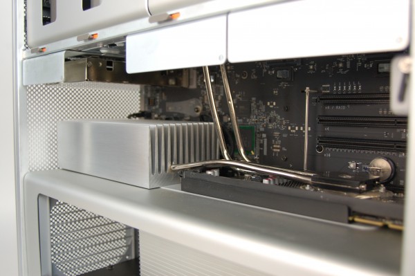 Eines muss man gleich vorweg erwähnen: Der High-Performance-Computer sieht aus wie ein Apple Mac Pro und bietet inklusive OS X-Betriebssystem alles was einen Pro ausmacht, jedoch ist Granny Smith etwas Besonderes und unterliegt nicht mehr der Garantieleistung des berühmten Apfels. Dafür geben die Waldenbucher auf ihr lüfterloses Mac Pro-Tuning eine zweijährige Garantie. Anders als beim Original wird kein 2,8 GHz starker Intel Xeon verbaut sondern ein L5630-Prozessor mit 2,13 GHz, der eine geringere Wärmeentwicklung besitzt und problemlos passiv gekühlt werden kann. Seine maximale TDP von nur 40 Watt schlägt sich auch im Gesamtstromverbrauch des Rechners nieder, der insgesamt um 100 Watt gesenkt werden konnte.
