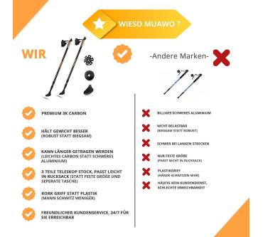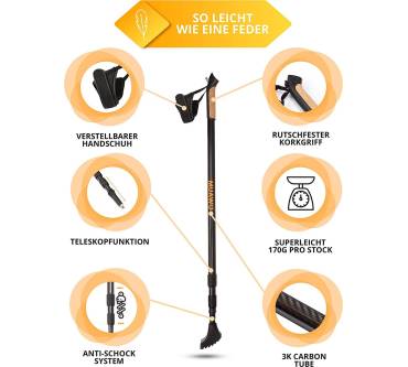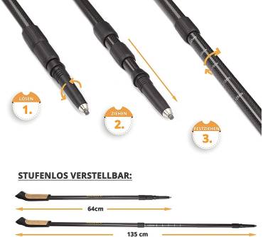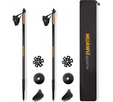 Die leichten Nordic Walking-Stöcke von Muawo sind aus Karbon gefertigt und kommen in Teleskop-Ausführung, so dass Sie sie bequem auf eine für Sie angenehme Größe einstellen können. Praktisch ist das auch, wenn sich die Umgebung ändert – perfekt also für Allrounder, die nicht immer nur auf ebenem Asphalt wandern wollen. Die Handschlaufe lässt sich einhändig bedienen, zudem gibt's bei diesem Modell mehr Zubehör in Form unterschiedlicher Gummipuffer für diverse Untergründe. Anfängern gefällt besonders der Preis, aber auch die grundsätzliche Qualität der Stöcke überzeugt. Einen echten Dämpfer bekommt das Modell aber in einem Test: Hier heißt es, dass die Ausführung der Handschlaufe eine technisch korrekte Ausführung des Nordic Walking verhindert.