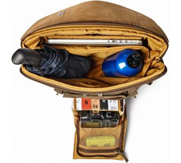 Der Innenraum ist mehrfach geteilt. Im oberen Bereich nehmen mehrere gepolsterte Fächer zum Beispiel ein Laptop mit bis zu 15 Zoll Bildschirmdiagonale und andere persönliche Dinge auf. Der untere Bereich enthält ein herausnehmbares Fach für die Kamera, zwei Objektive und weiteres Zubehör. Die Kamera kann dank einer Klappe an der Vorderseite bequem entnommen werden.