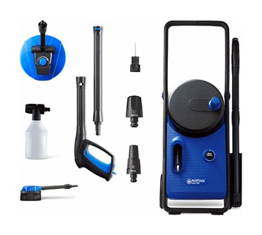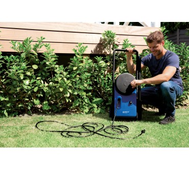 Der Core 150-10 PowerControl PA EU von Nilfisk kommt mit 150 bar Maximaldruck daher, was auch für härtere Verschmutzungen ausreichen sollte. Dank 10 Meter langem Hochdruckschlauch haben Sie in Kombination mit dem 5 Meter langen Netzkabel viel Spielraum und erreichen auch höher gelegene Regionen. Eine Schlauchtrommel ist integriert, der Griff klappbar. Nach der Arbeit können Sie das Gerät also platzsparend verstauen. Den Druck können Sie per Knopfdruck regulieren und so auch auf empfindlichere Flächen eingehen. An Zubehör werden grobe und feine Düse, Schaumsprüher, rotierende Bürste und Flächenreiniger standardmäßig mitgeliefert. Weitere Aufsätze können Sie zukaufen und dank Schnellkupplung leicht wechseln. Der Hochdruckreiniger ist auf einem Schlitten montiert, sodass Sie ihn leicht ziehen bzw. manövrieren können.