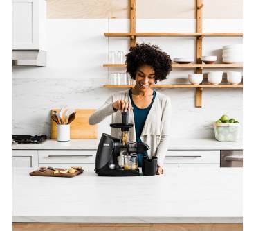 Der elegante Slow Juicer punktet mit der beliebten Kaltpresstechnologie. Der Motor ist nicht nur wesentlich leiser als bei klassischen Zentrifugalentsaftern, er arbeitet auch mit geringerer Drehzahl. Dadurch entsteht weniger Wärmeentwicklung und Ihr Obst und Gemüse wird vergleichsweise schonend entsaftet. Eine Besonderheit ist, dass Sie bei diesem Modell selbst wählen können, ob der Fruchtfleischgehalt im Saft gering, mittel oder hoch ausfallen soll. Diese Variation ermöglichen drei austauschbare Saftfilter, die im Lieferumfang enthalten sind. Das unerwünschte Fruchtfleisch landet im 710 Milliliter Auffangbehälter und der Saft im 500 Milliliter Saftkrug. Die Bedienung ist intuitiv und alltagstauglich. Kritik gibt es in Rezensionen für den etwas klein geratenen Einfüllschaft, hierfür sollte das Obst und Gemüse im Vorfeld ausreichend klein geschnitten, entkernt und vorbereitet werden. Harte Zutaten wie Wurzelgemüse stellen gut vorgeschnitten laut Anwendern kein Problem dar, die Saftausbeute ist angemessen. Die regulierbare Anti-Tropf-Funktion hält Ihre Küche sauber. Alle abnehmbaren Teile sind BPA-frei und zur eichten Reinigung spülmaschinengeeignet.