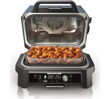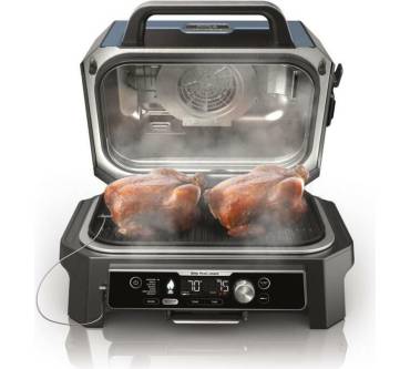 Mit diesem Elektrogrill von Ninja erzeugen Sie unter anderem Holzfeueraroma ohne klassische Holzkohle: Die integrierte Smokerbox wird einfach mit einer Handvoll Pellets betrieben. 2 Starter-Mischungen für kräftiges oder süßliches Aroma sind im Lieferumfang dabei. Weitere Garoptionen neben dem klassischen direkten und indirekten Grillen sind Rösten, Backen, Dörren, Aufwärmen und sogar das fettarme Frittieren per Heißluft. Alle Einstellungen können Sie per Smartphone erledigen und erhalten Infos über den Garvorgang in Echtzeit. Nutzen Sie das digitale Thermometer, müssen Sie sich laut Hersteller praktisch um nichts mehr kümmern. Die bisherigen Rezensenten sind zu über 75 Prozent sehr zufrieden mit dem Produkt und vergeben 5 Sterne. Vereinzelt berichten Nutzer aus anderen Ländern als Deutschland von einer nicht funktionierenden Appanbindung.