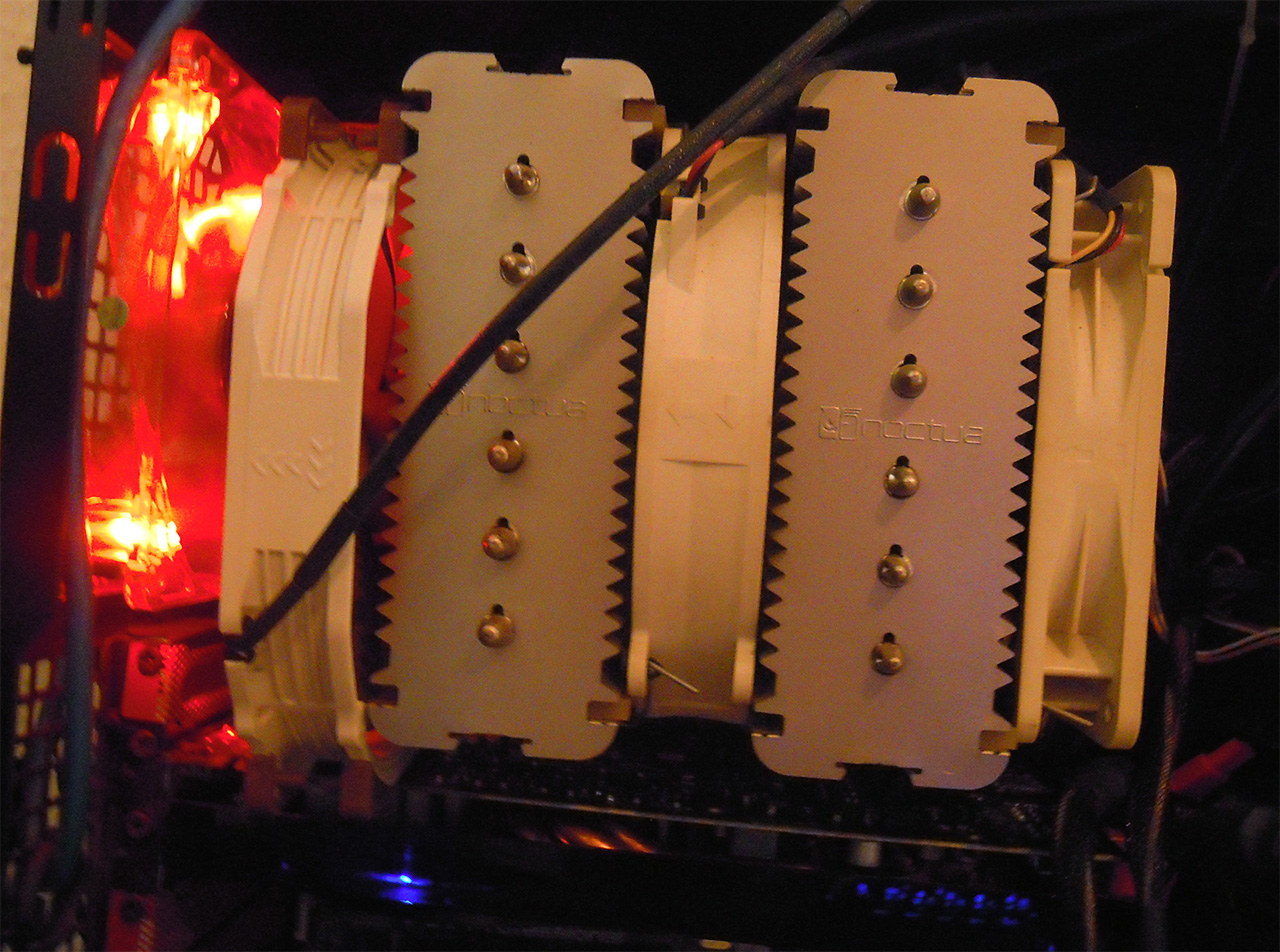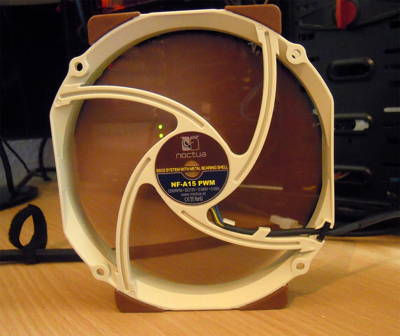 Das Testmuster der neuen A-Serie von Noctua wurde in Mittelposition an einem NH-D14 CPU-Kühler auf seine Leistungsfähigkeit überprüft. Unter 20-minütiger Belastung aller acht CPU-Threads durch Prime95 auf einen Intel Core i7-2600K@4,4GHz zeigte der Vorgänger NF-P14 im Solobetrieb eine CPU-Temperatur von 53 Grad Celsius an. Beim gleichen Durchlauf mit dem neuen NF-A15 sank die Temperatur auf 47,3 Grad Celsius. Bei einer Drehzahl von 1.284 Umdrehungen war der Lüfter nur in etwa 10 Zentimetern Entfernung durch ein leises Rauschen zu hören. OverClocker denken sicherlich gleich eine Doppel- oder Dreifachbestückung des CPU-Kühlers. Dabei ist nur zu beachten, dass durch die Kühlaufbauten von Spannungsreglern und RAM-Heatspreadern die Gesamthöhe von 160 auf 170 Millimeter anwächst – kein sonderliches Hindernis in einem guten Tower-Gehäuse.