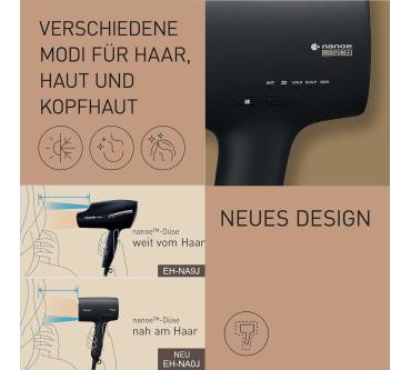Highlight des NA0J von Panasonic ist seine patentierte Technologie („Nano Moisture+ mit Mineral“): Einerseits wird der ionisierte Luftstrom mit Wasserpartikeln angereichert und andererseits durch Mineralien ergänzt. Ihre Haare werden dadurch während des Trocknens gepflegt und sollen sich geschmeidiger anfühlen. Sie haben 4 Temperatur- und 3 Geschwindigkeitsstufen zur Auswahl, auch ein Wechselmodus Kalt-Warm ist möglich. Letzterer soll Ihre Kopfhaut pflegen und die Haarstruktur verbessern. Um Hitzeschäden zu vermeiden, überwacht ein Sensor kontinuierlich die Temperatur. Mit dabei sind Diffusor und Stylingbürste, das extra lang Kabel erleichtert Ihnen das Handling. Im Test schneidet das Modell gut ab, hinkt aber hinter den Kollegen etwas hinterher. So scheint das Bedienfeld etwas ungünstig angebracht zu sein und die Leistungsstärke eher durchschnittlich.