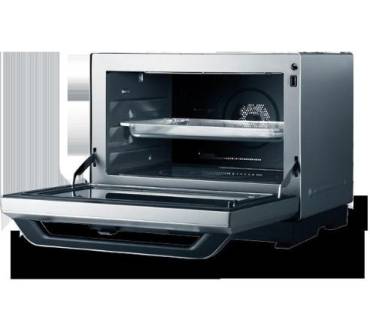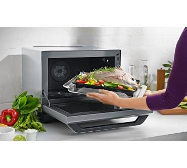 Mit satten 32 Litern Innenraumvolumen ist denn auch jede Menge Platz selbst für ganzes Geflügel und andere große Braten vorhanden. Das Gerät arbeitet mit 1.000 Watt Mikrowellenleistung, was selbst für dieses Volumen sehr üppig dimensioniert ist. Die Heißluftfunktion wartet mit 1.450 Watt auf, der Grill leistet 1.300 Watt. Letzterer besitzt drei verschiedene Leistungsstufen – bei Mikrowellen keine Selbstverständlichkeit. Auch der Dampfgarer ist praktisch gehalten: Im Inneren befindet sich ein integrierter Wassertank mit 650 Millilitern Fassungsvermögen, was einen Festwasseranschluss überflüssig macht.