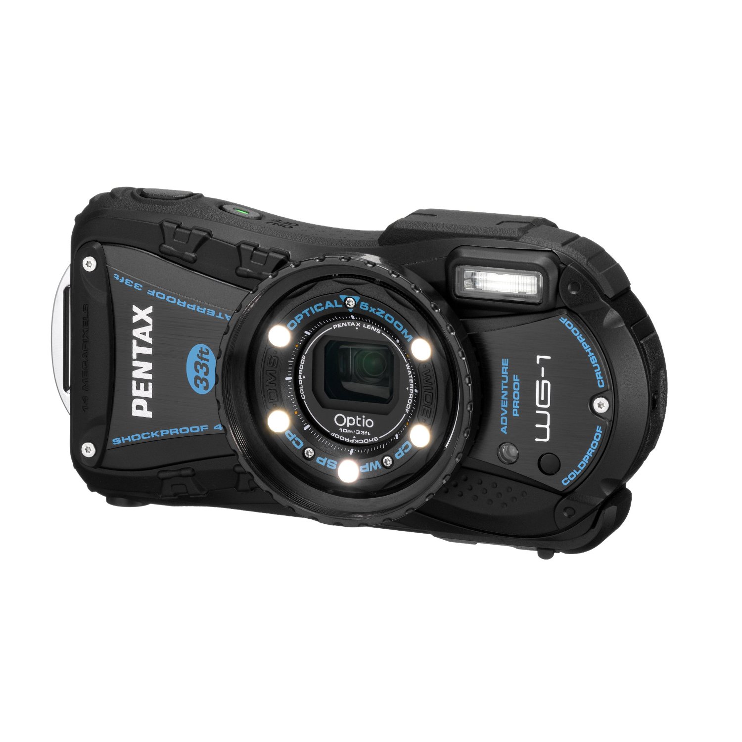 Um die empfindliche Kameraelektronik bestmöglich zu schützen hat Pentax ein robustes Gehäuse aus Aluminium und Gummi entwickelt. Dieses verspricht wasser- und staubresistent zu sein und Tauchgänge von bis zu 10 Metern und einen Fall aus 1,5 Meter Höhe unbeschadet zu überstehen. Darüber hinaus soll es auch Temperaturen von bis zu minus 10 Grad widerstehen und einem Druck von bis zu 100 Kilogramm standhalten. Doch auch hinsichtlich der technischen Ausstattung macht dieses Modell keine schlechte Figur. Die WG 1 verfügt über einen Sensor mit einer Auflösung von 13,6 Megapixeln und einen 5-fach optischen Zoom bei einem Brennweitenbereich von 28 bis 140 Millimetern. Videos kann sie in HD-Qualität mit 720p aufnehmen bei 30 Bildern pro Sekunde. Auslösezeit und