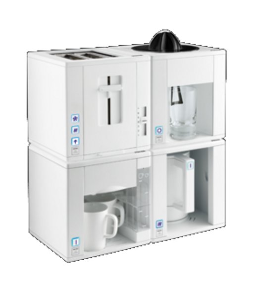 Der Trick, der diese funktionale und extrem platzsparende Bauweise ermöglicht hat, besteht ganz simpel darin, den Wasserkocher in einem Kubus unterzubringen. Auf die außergewöhnlich pfiffige Idee ist der holländischen Designer Jan Des Bouvrie gekommen, der sich mit Sicherheit jetzt schon über einen Designerpreis freuen darf. Die drei anderen Geräte – es handelt sich dabei um eine Kaffeemaschine, einen Toaster und eine Zitruspresse – wurden ebenfalls in einem Kubus verpackt, sodass sich alle vier Produkte wie Bauklötze zu einer kleinen Wand aufbauen lassen. Die Zitruspresse steuert zu dem Quartett außerdem noch einen weiteren Clou bei. An ihrer Rückseite befinden sich nämlich drei Steckdosen, um die anderen Geräte anschließen zu können, was wiederum bedeutet, dass für das ganze Ensemble auf