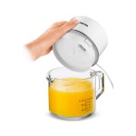 Die Bedienung der Zitruspresse ist denkbar unkompliziert. Der Motor mit dem Presskegel muss nur einfach auf den Glasbehälter aufgesetzt werden, die Bedienung selbst erfolgt durch das Aufdrücken der Zitrusfrüchte. Damit sich die Petra electric gleichermaßen für kleine und große Zitrusfrüchte eignet, liegen dem Lieferumfang gleich zwei unterschiedliche große Presskegel bei. Nach dem Auspressen wird der Motorblock mit einem Handgriff wieder abgenommen. Dabei soll eine Tropfstopp-Funktion verhindern, dass die Arbeitsfläche bekleckert wird. Saft, der nicht sofort benutzt wird, kann in der Glaskanne aufbewahrt werden. Zu diesem Zweck wird sie mit einem Deckeln verschlossen, dieser dient außerdem als Untersatz für die Maschine, damit sie beim Auspressen nicht auf glatten Arbeitsflächen wegrutschen kann. Das Fassungsvermögen des Glaskruges wiederum ist für eine Zitruspresse dieser Leistungsklasse ziemlich hoch, es beläuft sich auf 0,75 Liter. Es spricht also nichts dagegen, die Zitruspresse auch für die Zubereitung von zum Beispiel frisch gepressten Orangensaft am Frühstückstisch zu benutzen. Der Vorteil: Die Presse ist um einiges handlicher als ein großer Entsafter und lässt sich anschließend auch einfacher reinigen – ganz zu schwiegen davon, dass sie weniger Platz zum Verstauen benötigt und daher eine praktische Alternative für kleine Küchen darstellt.Gutes Preis-Leistungs-Verhältnis