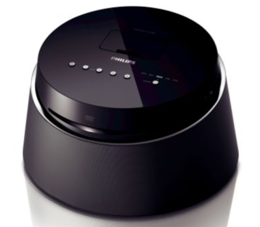Der Durchmesser des 4,7 kg schweren Systems liegt bei 273 mm, die Höhe bei 173 mm. Trotz kompakter Maße spart Philips nicht an der Technik: So verspricht der integrierte Subwoofer druckvolle Bässe, wobei die Gesamtausgangsleistung bei 50 Watt liegen soll. Das Gerät kommt mit den Tonformaten Dolby Digital, DTS und Stereo zurecht, für ein verbreitertes Klangbild sollen außerdem präzise positionierte Lautsprecher-Treiber sorgen. Komprimierte Musik wird dank „FullSound“-Technologie in besserer Qualität wiedergegeben, für schärfere Bilder sorgen das 1080p Upscaling und Progressive Scan. Die Verbindung zum Fernseher funktioniert entweder über den HDMI- oder über den Composite-Video-Anschluss. Eine Dockingstation für den iPod ist ebenfalls mit an Bord, gesteuert wird der Player über den angeschlossenen Bildschirm. Über die USB-Schnittstelle kann man außerdem auf externe Speichermedien oder USB-Sticks zugreifen. Und an der Rückseite befindet sich noch ein MP3-Link, über den auch MP3-Player Zugang zum CTS4000/12 finden.