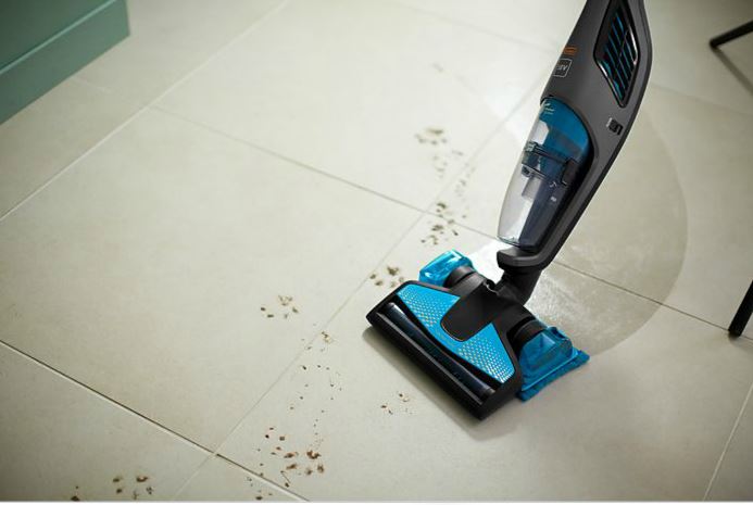 Nach dem Saugen von Hartböden bleiben bekanntermaßen oft eingetrockneter Schmutz und Flecken zurück, wenn aber der Boden nur nass aufgewischt wird, stören die Schmutzkrümel – nicht weniger ärgerlich. Warum also nicht zuerst den Boden saugen und anschließend aufwischen? Doch das macht zwei Arbeitsgänge erforderlich, die jedoch ab sofort der FC6401/01 in einem Aufwasch erledigt. Denn bei dem Gerät handelt es sich um eine praktische Kombination aus Akku-Staubsauger und Wischmob.