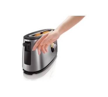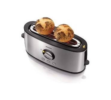 Mittlerweile beherrschen nahezu alle Toaster außer dem Rösten auch das Aufwärmen und Auftauen von Toasts beziehungsweise Brotscheiben. Einen gewissen Seltenheitscharakter hingegen besitzt die Möglichkeit, Toast einseitig zu rösten – häufig wird diese Funktion mit Bagels in Verbindung gebracht. Die Auswahl an Röstgraden wiederum fällt mit sieben Stufen zwar üppig aus, ist jedoch nicht außergewöhnlich. Der Croissant-/Brötchenaufsatz ist integriert und muss nur ausgeklappt werden, die Krümelschublade, essenzieller Bestandteil nahezu jedes Toasters, soll sich hingegen besonders leicht mit einer Hand herausziehen lassen. Philips weist außerdem darauf hin, dass die Toastkammern so konstruiert wurden, dass möglichst alle anfallenden Krümel tatsächlich in der Schublade landen und beim Rösten daher nichts verbrennen kann.Das Gehäusedesign des Toasters fällt durch seine schlanke Bauform angenehm ins Auge, das verwendete Edelstahl verleiht ihm zudem eine hochwertige Anmutung. Die Gehäusewand wiederum wurde wärmeisoliert, ein Kriterium, auf das vor allem Haushalte mit Kindern häufig achten – zurecht. Unterm Strich summieren sich die einzelnen Ausstattungsmerkmale des Philips zu einem runden Gesamtprodukt, das Funktionalität und Design wunderbar unter einen Hut bringt und daher auch mit Fuig und Recht etwas teurer als ein Durchschnittstoaster sein darf: Zurzeit ist der Toaster für knapp 95 EUR (Amazon) erhältlich.