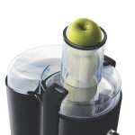 Nicht ganz der Wahrheit hingegen entspricht die von Philips vollmundig angekündigte außergewöhnliche Größe des Einfüllstutzens. Sie ist zwar größer als bei einigen Konkurrenzmodellen, fällt aber doch nicht so pompös aus, dass sie ganze Früchte, etwa Äpfel, aufnimmt. Immerhin muss Obst und Gemüse nicht ganz so klein vorgeschnitten werden wie bei anderen Modellen, um die Arbeit selbst jedoch kommt man kaum herum.
