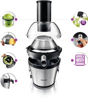 Aufgrund seines umgedrehten, also nach oben gewölbten Siebs soll der HR1871 bis zu zehn Prozent mehr Saft aus Obst und Gemüse herauspressen. Außerdem ist das Sieb selbst so gearbeitet, dass deutlich weniger Fruchtreste in ihm hängen bleiben als bei anderen Entsaftern. Das von Philips hergestellte Gerät lässt sich daher auch, wie der Hersteller betont, um einiges leichter und schneller reinigen.