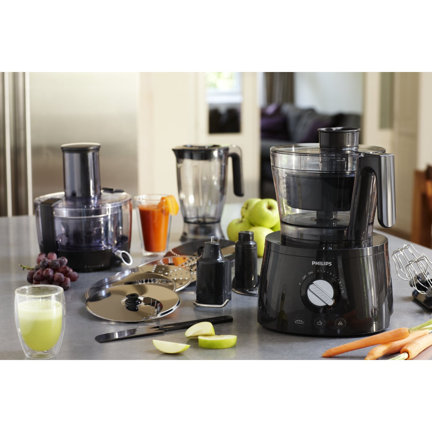 Die HR7777/90 lädt förmlich zum Sparen ein. Zum einen nämlich ersetzt die Küchenmaschine aus dem Hause Philips einen Sandmixer, ein Handrührgerät sowie einen Entsafter, außerdem verfügt sie noch über ein Schnitzelwerk. Alle Funktionen werden außerdem von einer Maschine erledigt, die für sich selbst nur wenig Platz beansprucht.