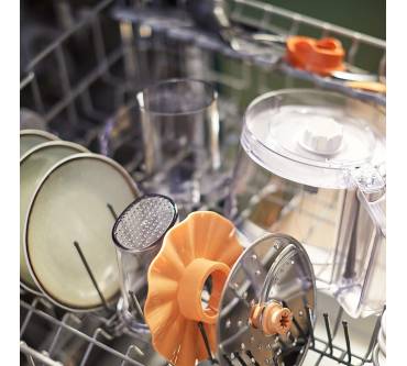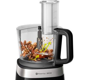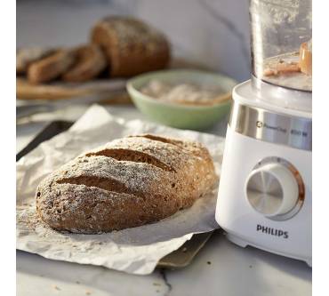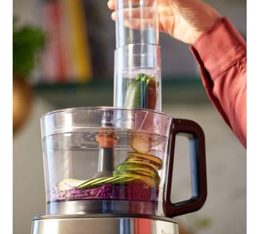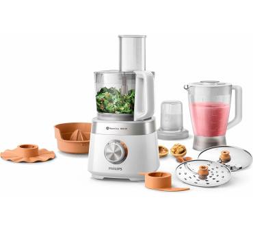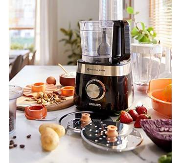 Mit der Küchenmaschine Philips Viva Collection HR7530/10 lassen sich zahlreiche Lebensmittel verarbeiten: Sie erhalten unter anderem verschiedene Schneidescheiben, eine Mühle, eine Zitruspresse und einen Knethaken. Die Leistung von 850 Watt ist ordentlich und so dürften auch harte Lebensmittel sicher und effektiv zerkleinert werden. Die Zubehörteile sind farbig markiert, sodass Sie die optimale Geschwindigkeit einfacher einstellen können – je heller die Farbe, desto geringer der Speed. Der Mixbehälter besteht leider nur aus Kunststoff – allerdings passt das zum Preis von derzeit rund 140 Euro. Die Küchenmaschine gibt es in weiteren Ausführungen, zum Beispiel mit geringerer Leistung als Philips Viva Collection HR7510/10.