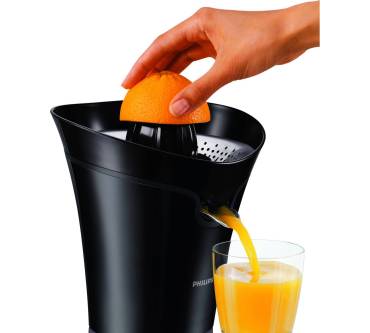 Allerdings, dies sei gleich vorab erwähnt, ist die HR 2752/90 primär dazu gedacht, dass der Saft direkt in ein Glas gepresst und nicht erst gesammelt wird – in den eigenen Auffangbehälter der Zitruspresse passen nur knapp 150 Milliliter. Und unter den Ausguss wiederum, auch dies bemängeln einige User, passen nur normale Trinkgläser. Bei größeren Gläser ist etwas Erfindungsgabe gefragt.