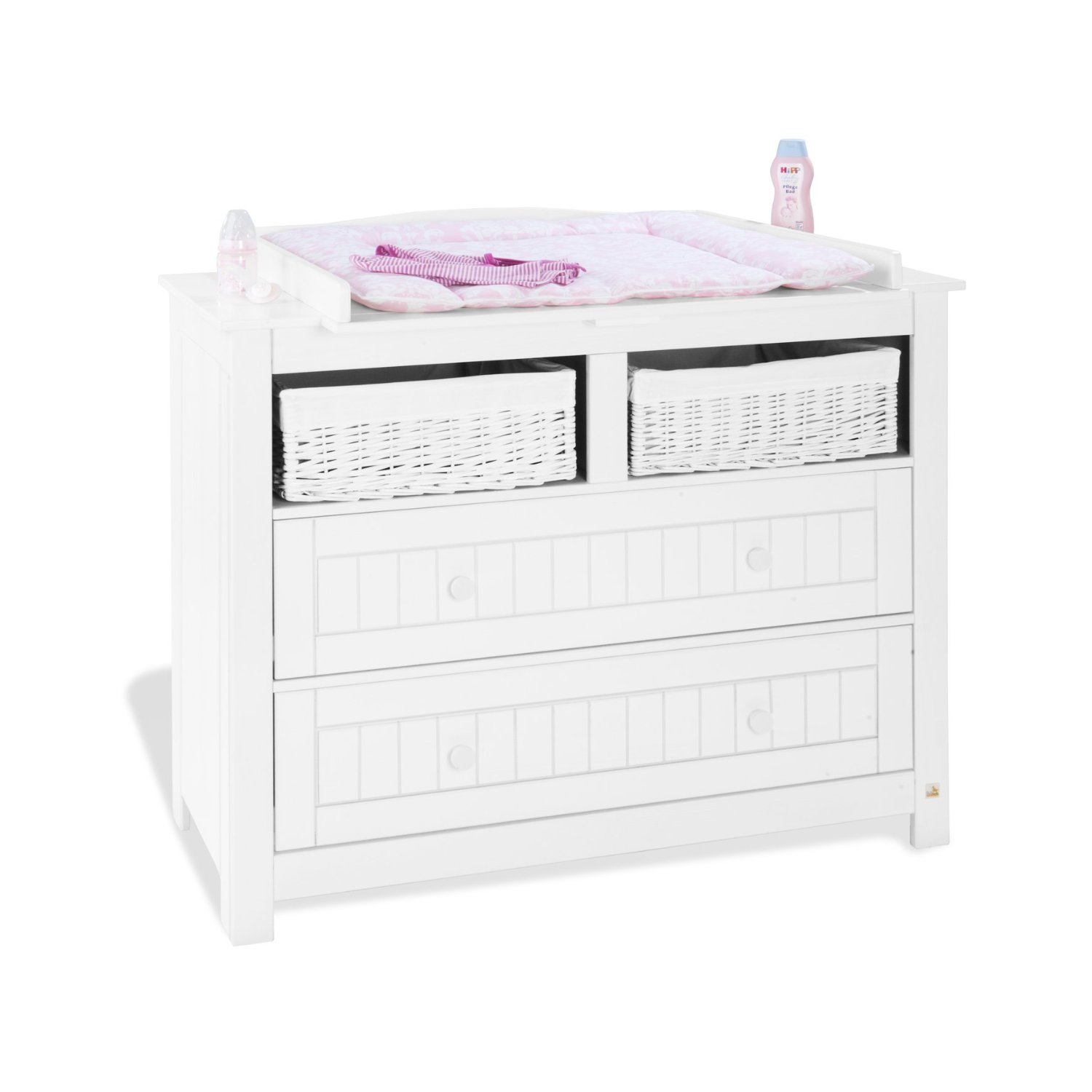 Nina nennt Pinolino seine Wickelkommode und führt damit einen Bestandteil seines hausinternen dreiteiligen Kinderzimmers im Sortiment. Auch als Einzelstück punktet das Pinolino-Produkt allein optisch, aber auch die übrigen Ausstattungsmerkmale klingen vielversprechend.