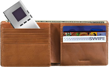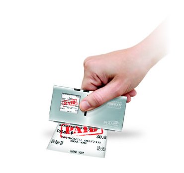 Der Scanner ist in etwa nur 86 mal 50 mal 4 Millimeter groß, und wer das ein oder andere Scheckartenfach freiräumt, kann ihn deshalb locker in seiner Brieftasche noch unterbringen, wenn es auf Reisen zum nächsten Geschäftstermin geht. Denn speziell für diesen Zweck ist der mobile Scanner gedacht: Seine Größe ist ideal dafür, Visitenkarten oder auch Rechnungen von Geschäftsessen noch vor Ort zu digitalisieren, und zwar mit den für portable Scanner üblichen 300 dpi. Sogar ein Mini-Display hat auf dem Gerät noch Platz gefunden, und wer will, kann in die Scans hineinzoomen. Abgelegt werden die digitalisierten Vorlagen in einem internen Speicher, der mit 64 MB zwar auf dem Papier mickrig ausfällt, de facto jedoch für einige Dutzend Visitenkarten oder auch Fotos-Scans locker ausreicht.