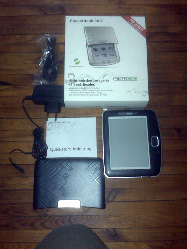 Das Pocketbook 360° ist ein E-Book-Reader im besonders handlichen Format von 12 x 15 Zentimetern und einem Gewicht von nur 180 Gramm, der nicht nur in einer Handtasche sondern auch bequem in einer Jackentasche Platz findet. Ein abnehmbarer Display-Schutz, der rückseitig wieder aufgesteckt werden kann, verhindert eine Beschädigung des Anzeigefeldes. Schon beim Auspacken stellt man fest, dass der Lieferumfang mit Netzteil, Mini-USB-Kabel, Trageschlaufe und Bedienungsanleitung komplett ist.
