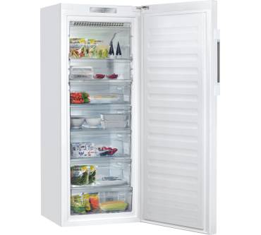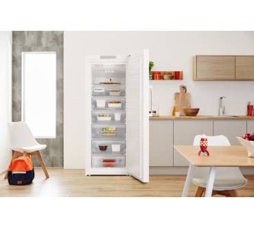 Viel Platz für Ihr Gefriergut bietet der Privileg PFVN 84, der vor Einführung der neuen Energieeffizienzskala die Zusatzbezeichnung A+++ Edition50 trug. Heute ist er in der neuen Klasse E eingeordnet (auf einer Skala von A bis G). Der Nutzinhalt beträgt 340 Liter, die sich auf sieben transparente Fächer verteilen. Zwei davon sind extragroß und damit ideal für sperriges und großes Gefriergut. Mit einem Gefriervermögen von 30 Kilogramm innerhalb von 24 Stunden arbeitet das Gerät sehr effizient. Dabei bleibt der Energieverbrauch im halbwegs grünen Bereich. Rund 269 kWh im Jahr werden erreicht. Als Aufstellorte kommen sowohl Keller als auch Küche infrage; die Geräuschentwicklung ist mit einem Wert von 41 Dezibel noch in Ordnung. Dank NoFrost-Funktion können Sie sich das Abtauen sparen. Insgesamt überzeugt der Privileg-Gefrierschrank, sodass der Preis von rund 600 Euro nicht zu hoch ist.
