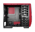 Der nur 44,5 Zentimeter kleine Midi-Tower verfügt jedoch über eine Tiefe von 52 Zentimetern, die die Unterbringung eines vollwertigen ATX-Mainboards mit langen Grafikkarten ermöglicht. Das I/O-Panel ist hinter der Fronttür unterhalb der vier großen Einschüber untergebracht und bietet neben Audio und USB 2.0 auch einen USB 3.0-Port. Der Festplattenkorb ist in „Fahrtrichtung“ ausgerichtet und kann vier HDDs aufnehmen. Alle Laufwerke werden ohne weiteres Werkzeug in das System integriert.