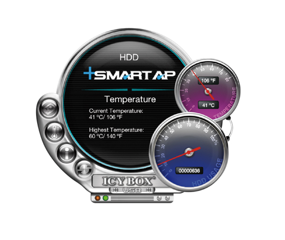 Raidsonic hat sich für sein neues externes Festplattengehäuse Icy Box IB-223StU ein ganz besonderes optisches Gimmick einfallen lassen. Das Festplattengehäuse wird zusammen mit einer Software namens Smart AP ausgeliefert, die wie in einem Auto-Cockpit ein Armaturenbrett mit "Tachometern" anzeigt. Auf diesen lassen sich zu jeder Zeit wichtige Informationen darüber anzeigen, was im verborgenen Innern des Gehäuse so vor sich geht. Auf der Anzeige ist die aktuelle Temperatur und Transferrate, die Festplattenkapazität sowie die Anzahl der Ein-/Ausschaltvorgänge ablesbar. Die Tachometer sind aber nicht nur eine optische Spielerei, die das Ablesen erleichtern soll. Der Anwender kann auch Temperatur- oder Kapazitätsgrenzen definieren. Werden diese erreicht, meldet sich die Software mit einem Alarm.