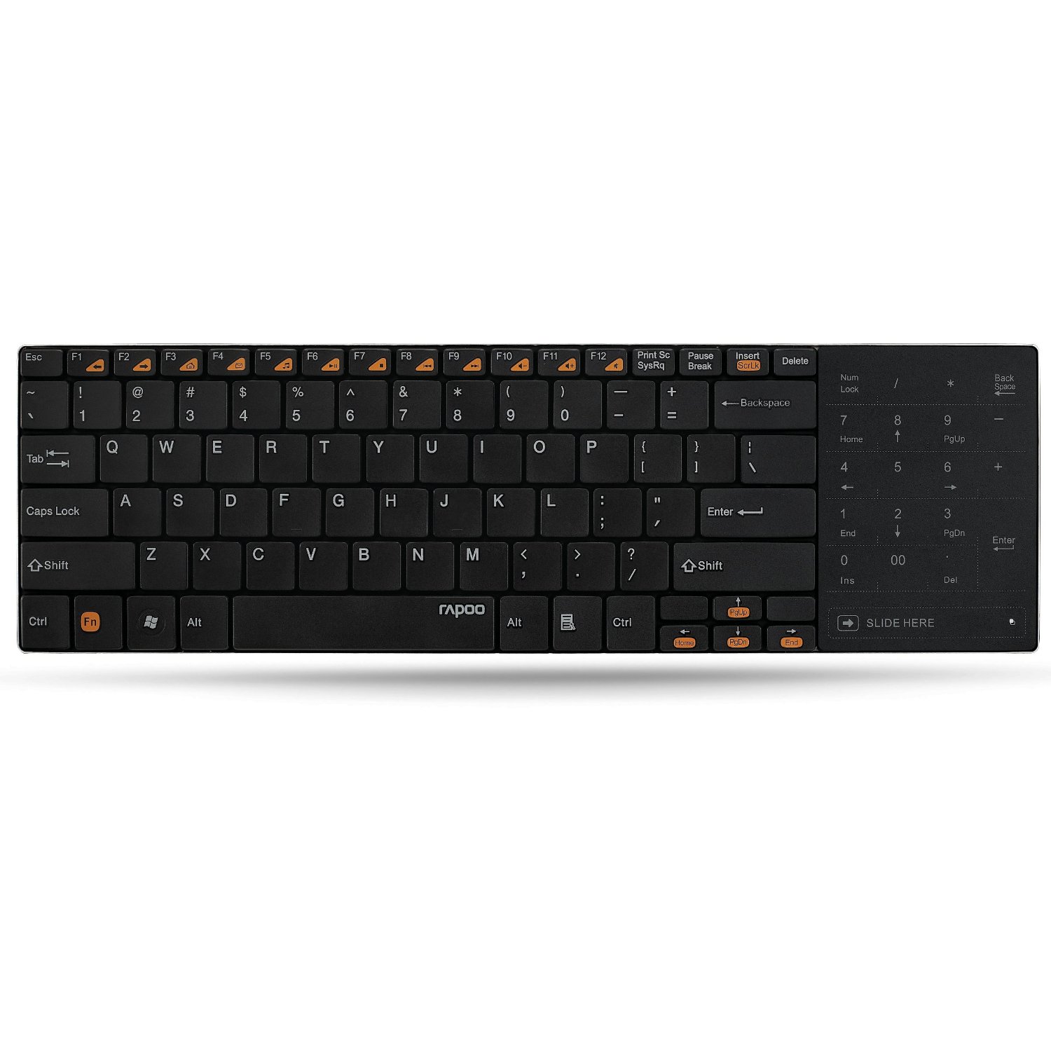 Auf einer Fläche von gerade einmal 11 x 35 Zentimetern eine Kompletttastatur, ein Touchpad sowie einen Ziffernblock unterzubringen, fällt nicht gerade leicht. Der chinesische Hersteller behilft sich deshalb mit einem raffinierten Trick, indem das eigentliche Touchpad mit zwei Funktionen belegt wird. Zum einen kann es als gewöhnliche berührungsempfindliche Fläche benutzt werden, die eine separate Maus ersetzt und zur Steuerung und Navigation des Cursors mit Fingerbewegungen ermöglicht. Mit einer einfachen Fingerbewegung verwandelt sich das Touchpad aber auch in einen Ziffernblock, der Wechsel erfolgt mit einem Fingerstreich über das entsprechende Switchfeld. Der Ziffernblock ist daher nicht, wie von herkömmlichen Tastaturen gewöhnt, mit physischen Tasten belegt, ein Nachteil für den Benutzer sollte sich daraus aber nicht ergeben – das Prinzip ist von einem Smartphone her bekannt. Des Weiteren lassen sich mittels der „FN“-Taste die Funktionstasten in Schnelltasten zur Steuerung eines Media-Player umwandelt, mit anderen Worten: Die Tastatur von Rapoo ist eine vollwertige Multimedia-Tastatur, mit der eine Heimkino-Umgebung gesteuert werden kann. Die Kommunikation mit den Endgeräten läuft dabei über die bewährte 2,4-GHz-Funktechnologie und zwar, wie üblich, maximal bis zu einer Entfernung von zehn Metern. Die Rapoo bietet sich also auch als „Couch“-Tastatur an. Darüber hinaus punktet sie außerdem mit einem extrem flachen Gehäuse – es misst lediglich 5,8 Millimeter –, dessen Unterboden aus gebürstetem Edelstahl besteht. Die Tasten schließlich sind scherenartig aufgehängt. Diese Technik bietet einen hohen Tastenkomfort, der vor allem von Vielschreibern sehr geschätzt wird, denn die Tasten müssen aufgrund ihrer Aufhängung nicht unbedingt exakt getroffen werden.