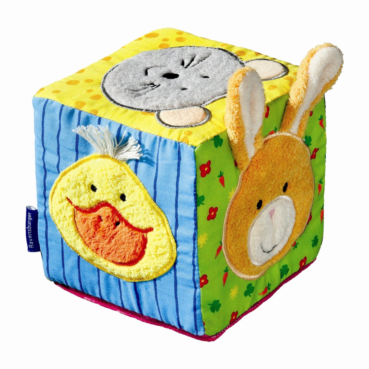 Der Würfel spielt zur jeweils oben liegenden Seite passende Sounds zu den applizierten Plüschfiguren ab und sorgt, wie begeisterte Kunden berichten, für eine nahezu unerschöpfliche Motivation zum Krabbeln, Werfen und Rollen. Besonderes Plus: An den applizierten Schafen, Häschen, Enten, Bären und Mäusen sitzen greifbare Elemente. So ist er trotz seiner Kantenlänge von 12 Zentimetern besonders leicht zu halten und zu greifen. Ebenfalls positiv, wenn auch selbstverständlich ist das geringe Gewicht und die weiche Verarbeitung zu bewerten, mit dem das Babyspielzeug als Gefahrenquelle ausscheidet.