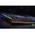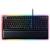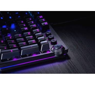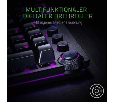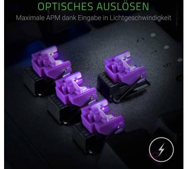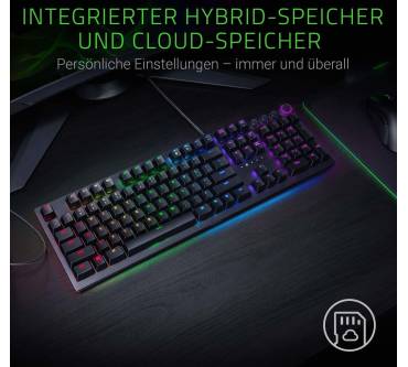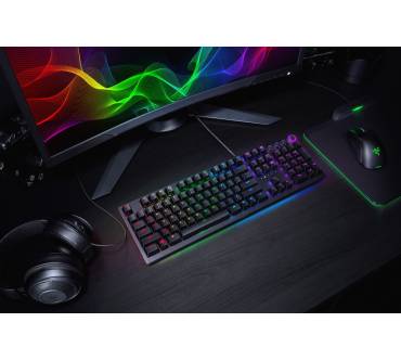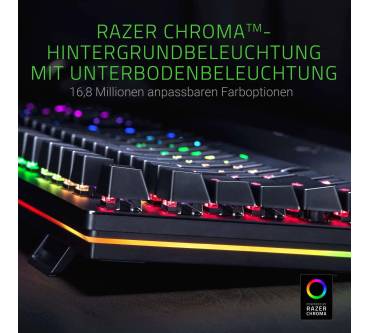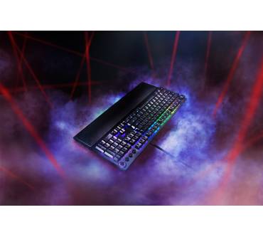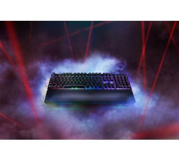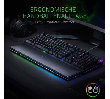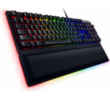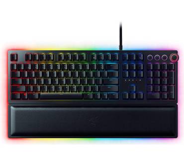 Anspruchsvolle Gamer sollen mit der Razer Huntsman bedient werden. Das Hauptargument des Herstellers für die mechanische Tastatur ist der hier verbaute Schaltertyp optisch-mechanischer Art. Die Auslösung einer Taste wird per Lichtschranke registriert und die darunter befindliche Mechanik sorgt für ein sattes Klickgeräusch. Spürbar ist die Auslösung der Taste aber kaum. Trägt man ein Gaming-Headset, fällt das akustisch-haptische Feedback entsprechend dürftig aus. Der kurze Hubweg soll wertvolle Millisekunden im Eifer des Gefechts sparen, was aber keine ernsthaften Auswirkungen auf die spielerische Leistungen haben dürfte. Die mitgelieferte gepolsterte Handballenablage ist äußerst bequem und sorgt für eine gesunde Handposition. Die Beleuchtung ist besonders detailliert konfigurierbar und auch am Rand der Tastatur wurde eine Beleuchtung untergebracht.