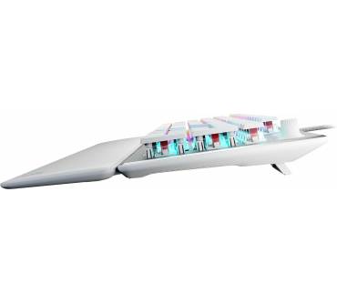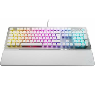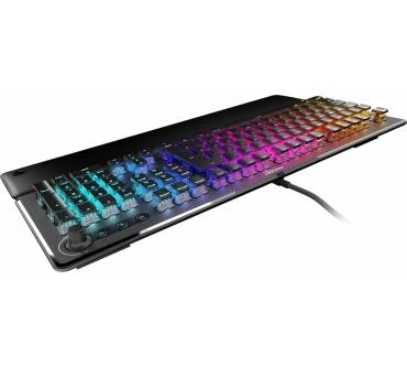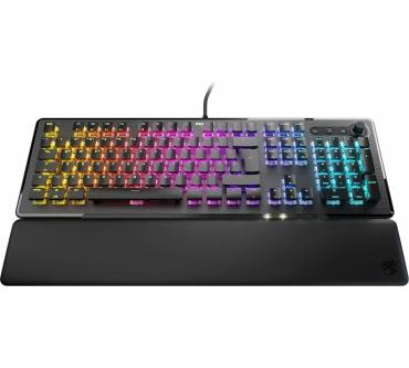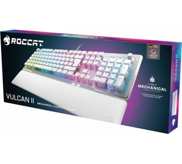 Bei der Roccat Vulcan II handelt es sich um eine solide Full-Size-Gaming-Tastatur, die mittels USB-Kabel verbunden wird. Letzteres ist leider nicht abnehmbar, sondern fest mit dem Gehäuse verbunden. Die Volcan II ist mit hervorragenden Tasten ausgestattet, die ein geschmeidiges Tippen ermöglichen und sich unkompliziert austauschen lassen. Sie halten etwa 80 Millionen Anschläge aus und auch abgesehen davon macht die toll verarbeitete Tastatur einen sehr robusten Eindruck. Die Form der Tastatur besitzt gute ergonomische Eigenschaften, einzig die Handballenauflage ist ein wenig hart. Durch die RGB-Beleuchtung sieht die Tastatur auch in der Dunkelheit äußerst schick aus. Die Ausstattung fällt im Vergleich zur Volcan II Max desselben Herstellers zwar deutlich weniger umfangreich aus, ist aber dennoch grundsolide.