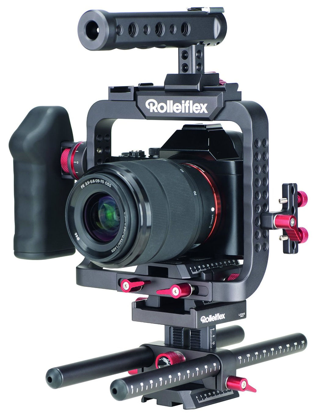 Spiegellose System-Kameras wie die GH4 von Panasonic oder die Alpha-7-Modelle von Sony entwickeln sich immer mehr zu Video-Spezialisten. Wer mit den kompakten Kameras professionelle Aufnahmen machen möchte, kommt jedoch oft nicht um umfangreiches Zubehör herum. Um dieses dann platzsparend mit der Kamera zu kombinieren, eignen sich Kamera-Käfige wie der Rolleiflex 4K S-Cage.
