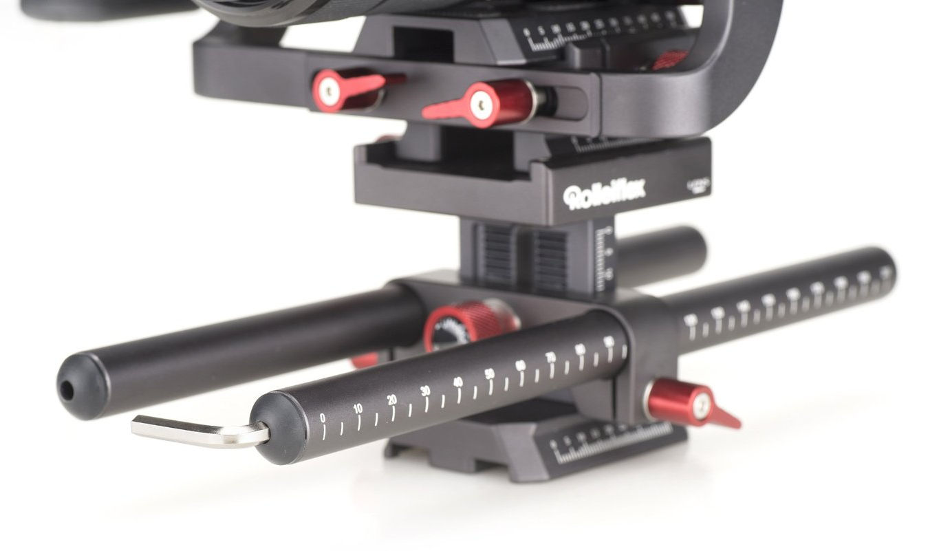 Der Käfig sitzt auf einer Stativplatte, die mit dem im Lieferumfang enthaltenen Rod-System verbunden werden kann. Zwei 20 Zentimeter lange Rohre gehören bereits zum Lieferumfang. An ihnen können beispielsweise ein Follow-Focus oder eine Streulichtblende angebracht werden. Der Abstand zwischen den Rods und der Kamera, beziehungsweise der Optik, kann über eine Höhenverstellung geregelt werden.