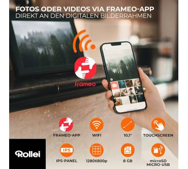 Der Smart Frame WiFi 100 von Rollei kann dank seines WiFi-Moduls direkt vom Smartphone mit Bildern oder kurzen Videos bestückt werden. Dafür muss darauf lediglich die Frameo-App installiert werden. Der digitale Bilderrahmen hat einen acht Gigabyte großen internen Speicher, der für rund 7.000 Bilddateien oder 250 Videos ausreichen soll. Eine Speichererweiterung um weitere 32 Gigabyte ist mithilfe einer microSD-Karte möglich.