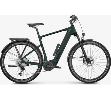 Mit der neuen Mayor-Serie schickt Versender Rose eine potente Tourenflotte ins Rennen. Schaltung und Bremsen stammen aus der renommierten Highend-XT-Gruppe von Shimano, wobei der ausgesprochen kraftvolle CX-Motor aus Boschs Performance-Serie im Verbund mit dem üppigen Schaltbereich selbst anspruchsvollste Topografien ohne viel Beinarbeit meistern kann. Der 750 Wh große Akku passt da ebenfalls hervorragend ins Bild. Für spritzige Geländefahrten sieht man es im Testumfeld nicht. Eine kernigere Bereifung würde das Offroad-Karma allerdings erheblich verbessern. Denn immerhin bringt der Tourenbolide eine gut einstellbare und sensible Luftfedergabel mit 100 mm Federweg mit. Potenzial wäre also da. Die Sitzposition beschreiben die Tester als nicht zu sportlich und absolut tourentauglich – durch den breiten Lenker und kurzen Vorbau lasse sich das Rose präzise manövrieren. In Sachen Fahrstabilität gibt es selbst bei voll beladenem Gepäckträger keine Punktabzüge. Weiterhin kann das Pedelec durch eine hervorragende Verarbeitung sowie eleganten Details wie die Sattelrohrklemmung und eine ästhetisch ansprechende Metallic-Lackierung überzeugen. Hinzu kommt eine erstklassige Beleuchtungsanlage, bestehend aus einem hellen Litemove-Scheinwerfer und einer sauber im Gepäckträger eingefassten Supernova-Rückleuchte.