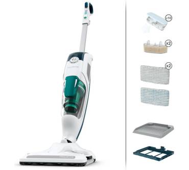 Der Dampfreiniger von Rowenta soll Ihnen als 2-in-1-Gerät die Reinigung von Hart- und Teppichböden leichter machen. In einem Arbeitsgang saugen Sie und reinigen die Bodenfläche anschließend mit heißem Dampf. Der Sauger arbeitet nach dem Zyklon-Prinzip, um das Nachkaufen von Staubbeuteln müssen Sie sich also nicht kümmern. Die Dampf-Funktion sorgt für ein Plus an Hygiene, der überwiegende Teil der potentiell gefährlichen Keime soll durch die hohe Reinigungstemperatur unschädlich gemacht werden. Eine Befüllung des Wassertanks reicht für den halbstündigen Betrieb aus. In das Dampfsystem integriert ist ein Aroma-Diffusor, der für einen angenehmen Geruch der gereinigten Flächen sorgt. Als Duftstoff verwenden Sie ein ätherisches Öl Ihrer Wahl. Bereits kurz nach dem Einschalten können Sie mit der Reinigung beginnen, der Rowenta ist in nur 30 Sekunden betriebsbereit. Der Reiniger wird an einem ergonomisch geformten Griff geführt. Mit im Lieferumfang dabei sind mehrere waschbare Wischtücher, Kalkfilter für das Reinigungswasser, ein Teppichgleiter und ein Schaumfilter.