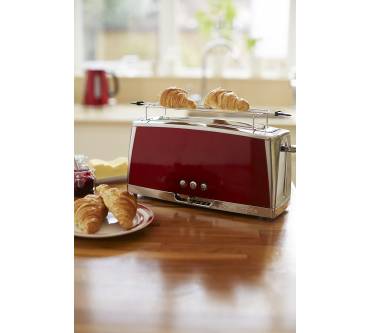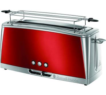 Der Russell Hobbs Luna Solar Red 23250-56 ist ein extra starker Langschlitz-Toaster mit Schnell-Toast-Technologie und 1.420 Watt Leistung. Er eignet sich besonders gut für Haushalte, in denen es morgens schnell gehen muss. Die Bräunung erfolgt laut Hersteller um 55 Prozent zügiger als bei herkömmlichen Toastern. Die langen Schlitze ermöglichen zudem das Rösten von zwei Toastscheiben auf einmal, was Familien und Mehrpersonenhaushalten entgegen kommt. Brotschreiben, Brötchen oder Baguettes können dank Brötchenaufsatz ebenfalls erwärmt oder gegrillt werden.