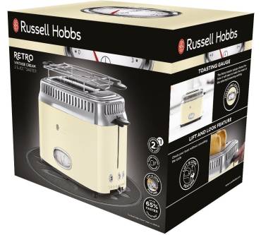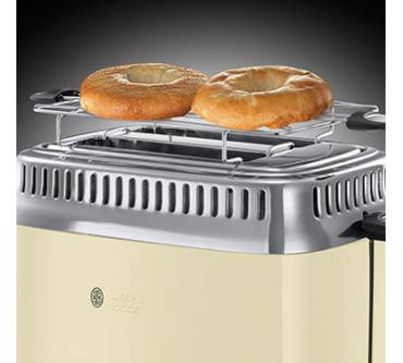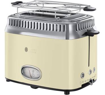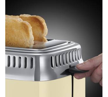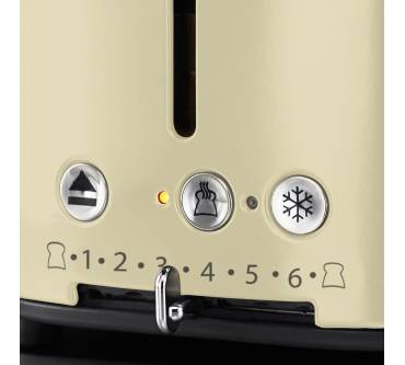 Der Russell Hobbs Retro Vintage Cream Toaster hebt sich nicht nur durch seine Schnell-Toast-Technologie von herkömmlichen Modellen ab, sondern auch mit seinem Retro-Style. Die Optik sorgt dafür, dass man das Gerät auch bei Nichtgebrauch gerne als Blickfang in der Küche stehen lässt. Passende Kaffeemaschinen und einen Wasserkocher bietet die Serie ebenfalls. Das Modell ist mit einer besonderen Countdown-Anzeige ausgestattet, wodurch man die Röstdauer während des Toast-Vorgangs im Blick hat. Testern zufolge ist diese jedoch mehr nette Spielerei als eine funktionale Zeitanzeige.