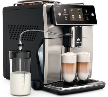 Der Kaffeevollautomat SM 7683/00 Xelsis von Saeco bereitet je nach Wunsch eine von 15 Kaffeevarianten zu. Der Milchtank ist dafür mittels Schlauch mit der Maschine verbunden und saugt die Milch zum automatischen Aufschäumen an. Unter den höhenverstellbaren Auslauf passen große Latte-macchiato-Gläser, wie auch kleine Espresso-Tassen. Durch die verschiedenen Reinigungsfunktionen für die Kaffee und Milchleitungen bleibt die Qualität des Kaffees stets gleich hoch. Ist das Wasser aus der Leitung sehr hart, bietet sich der optional integrierbare Wasserfilter an. Das Entkalkungsprogramm entfernt die möglichen Kalkablagerungen. Ein großes Touchdisplay erleichtert den Weg durch alle Menüs und Einstellungen. Die Temperatur, die Kaffeestärke und auch die Füllmengen lassen sich variieren und in insgesamt sechs Benutzerprofilen speichern.