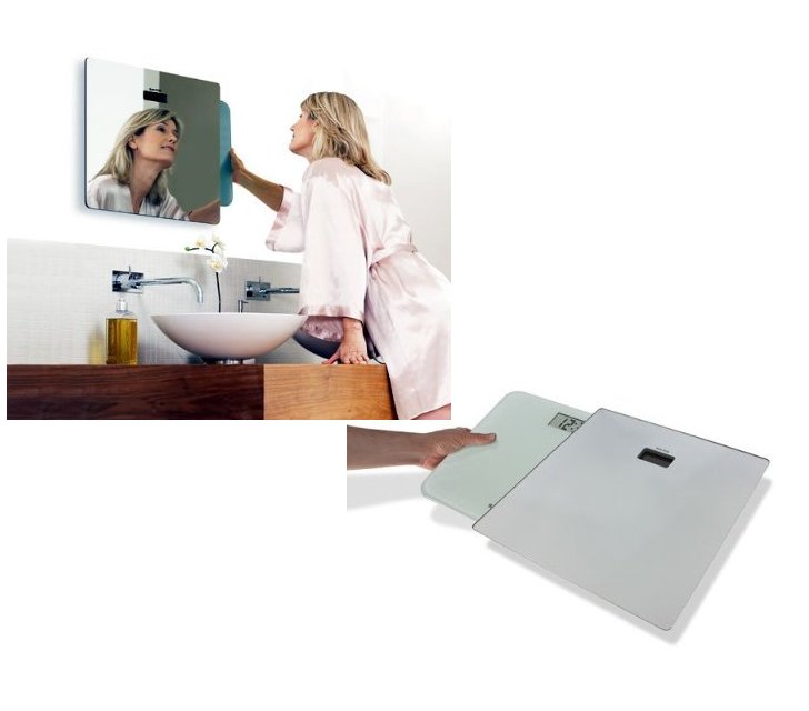 Der englische Hersteller Salter hat sich für seine Personenwaage 9034 einen recht außergewöhnlichen Aufbewahrungsort ausgedacht: Die Waage wird nämlich an die Wand gehängt und übernimmt dort die Funktion eines Spiegels.
