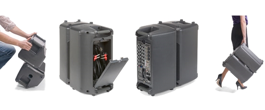 Damit man die knapp 17 Kilogramm schwere Beschallungsanlage bequem von A nach B transportieren kann, lassen sich die einzelnen Komponenten zusammenbauen. Mit an Bord ist ein Verstärker der Klasse D, der das System mit 2 x 150 Watt befeuert. Den beiden Lautsprecherboxen hat Samson jeweils einen 8-Zoll-Tieftöner und einen 1-Zoll Titan-Hochtöner spendiert. Der Hochtöner sitzt in einem hornähnlichen Trichter, der einen Abstrahlwinkel von 60 x 90 Grad haben soll. Der Mixer besitzt zwei Stereo-Eingänge, vier Mikrofon- beziehungsweise Line-Eingänge und einen Eingang mit Phantomspeisung zum Anschluss eines Kondensator-Mikrofons. Obendrein hat man ein iPod-Dock integriert. Lautstärke sowie Bässe und Höhen der acht Kanäle lassen sich getrennt voneinander einstellen.