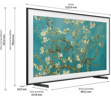 Der Fernseher gehört der The-Frame-Reihe an, die einige Besonderheiten mitbringt. Sie können ihn in verschiedene Rahmen kleiden, um die Optik eines Bilderrahmens zu erzeugen. Versetzen Sie den Fernseher zusätzlich in den „Art Mode“, der eine Bilder-Show abspielt, ist der er von einem echten Gemälde kaum zu unterscheiden. Die Bildschirmoberfläche ist matt und verhindert Spiegelungen. In puncto Smart TV gibt’s nichts zu meckern: Samsungs Betriebssystem Tizen stellt alle gängigen Streamingdienste bereit, etwa Amazon, Netflix oder Disney+, erlaubt aber auch den Zugriff auf eine Vielzahl weiterer Anwendungen. Per HbbTV ist es zudem möglich beim Zappen in die Online-Mediatheken der TV-Sender zu navigieren. USB-Aufnahmen sind ebenfalls möglich, wenn eine externe Festplatte angeschlossen ist.