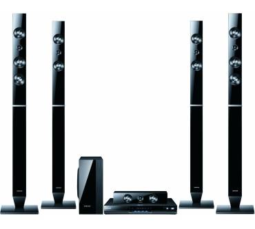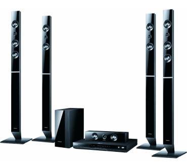 Verantwortlich dafür ist eine speziell entwickelte Technologie namens 3D-Sound-Plus, die laut Hersteller den „vertikalen und horizontalen Surround-Sound“ optimal kombiniert. Nähere Details zu der genannten Technik verrät der Hersteller leider nicht. Klar ist nur, dass die Tonsignale über vier 130 Zentimeter hohe Standspeaker, eine Centerbox und einen separaten Subwoofer ins Wohnzimmer transportiert werden. Das komplette Lautsprechersystem soll es auf eine Gesamtausgangsleistung von 1.000 Watt bringen. Für die nötige Soundqualität sorgen zudem Decoder für die aktuellen Tonformate Dolby Pro Logic II, Dolby TrueHD und DTS-HD. Die Anlage verfügt darüber hinaus über einen integrierten Upscaler, der Videosignale in gewöhnlicher Auflösung auf bis zu 1080p hochrechnet. Zudem lassen sich Filme bei Bedarf jederzeit von 2D in 3D umwandeln. Neben den genannten Blu-rays unterstützt die Anlage DVDs, CDs sowie die üblichen Rohlinge, also DVD-R/RW, DVD+R/RW und CD-R/RW. Bespielen kann man die Datenträger mit zahlreichen Videoformaten (AVCHD, DivX, DivX-HD, MKV-HD, WMV, XviD), JPEG-Fotos und komprimierten Sounddateien (AAC, MP3, WMA). Alternativ lassen sich die Formate auf einem tragbaren Stick speichern und per USB zur Anlage schicken. Die Verbindung zum Fernseher erfolgt per HDMI 1.4, Komponente oder Composite Video, zudem gibt es einen optischen Digitaleingang sowie eine Dockingstation für iPod und iPhone. Via DLNA kann man die Anlage schließlich ins Netzwerk integrieren und via Smart Hub auf diverse Online-Inhalte (Tagesschau, Facebook) zugreifen. Die Verbindung ins Internet erfolgt über Ethernet.