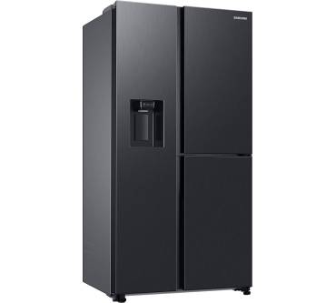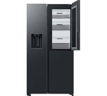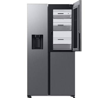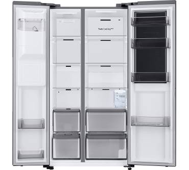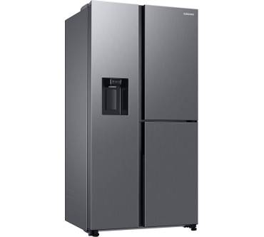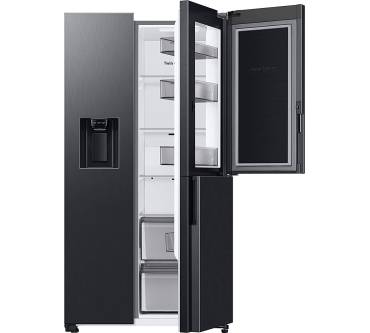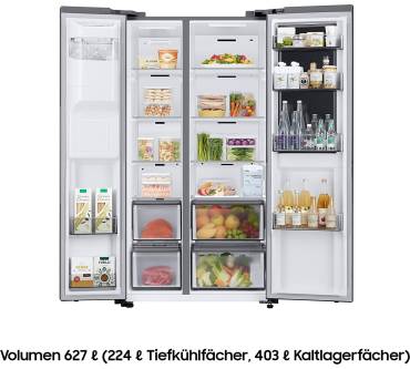 Samsung präsentiert mit dem RH68B8521S9/EG einen eleganten Side-by-Side mit praktischen Extras zum entsprechend anspruchsvollen Preis. Bis zu 15 kg können Sie pro Tag einfrieren, insgesamt fasst dieser Bereich 224 Liter. Die Kühlzone mit beachtlichen 402 Liter Volumen punktet unter anderem durch die flache Kühlöffnung an der Rückwand, die einen effizienten Belüftungskanal bewirkt. Dadurch haben Sie selbst bei voller Beladung eine gleichmäßige Temperatur im gesamten Bereich. Eiswasser und -würfel entnehmen Sie schnell von außen, ein 4,5 Liter fassender Wassertank ist integriert. Für den schnellen Zugriff auf Snacks und Getränke können Sie die obere Hälfte des Kühlschranks getrennt öffnen. Im Test schneidet der Samsung gut ab, lediglich der optische Alarm bei einem Stromausfall wird als mangelhaft eingestuft.