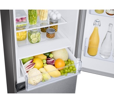Mit der Kühl-Gefrierkombination RL36T600CSA/EG RB7300 hat Samsung ein Modell für große Haushalte im Programm. Sie nutzen insgesamt 365 Liter Nutzinhalt, wovon 251 Liter auf den Kühlbereich fallen. Dabei zeigt sich das Gerät in relativ kompakten Maßen. Möglich machen das besonders dünne Gehäusewände, vom Hersteller Space Max genannt. Eine Abtauautomatik in beiden Bereichen erhöht den Komfort: Sie leitet Feuchtigkeit automatisch ab, sodass Eis erst gar nicht entsteht. Auf Knopfdruck senken Sie im Kühl- und Gefrierbereich die Temperatur kurzfristig ab. So frieren Sie Lebensmittel sicher ein und kühlen etwa Getränke blitzschnell ab. Die erfreulichen Funktionen paart Samsung mit einem geringen Energieverbrauch: Er liegt bei 166 kWh im Jahr, was für das Format wenig ist. Auch arbeitet die Kombi mit einem Schalldruckpegel von 35 Dezibel sehr leise. Rund 650 Euro werden hier fällig – das ist wenig und der Kauf lässt sich damit empfehlen.