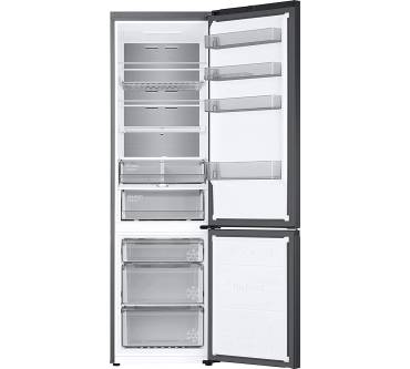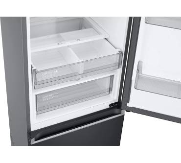 Die Kühl-Gefrierkombination von Samsung hält 390 Liter nutzbaren Stauraum für Ihre frischen Vorräte bereit. Zahlreiche Einschubmöglichkeiten und ein faltbarer Einlegeboden verschaffen Ihnen viel Spielraum zur individuellen Platzeinteilung. Für die gleichmäßige Verteilung der Kälte sorgt ein Umluft-System. In einer zweigeteilten Schublade haben Sie die Möglichkeit, je nach Lebensmittel zwei unterschiedliche Temperaturen einzustellen. Zudem regulieren Sie in der Gemüse-Box die Luftfeuchtigkeit. Für einen guten Überblick über Ihre Lebensmittel ist eine LED-Beleuchtung vorhanden. Im Gefrierteil übernimmt ein NoFrost-System den wartungsfreien Betrieb. Die Temperaturen im Kühl- und im Gefrierteil stellen Sie separat über ein außenliegendes Touch-Panel mit Display ein. Mit einem Lärmwert von 35 Dezibel ist der Samsung deutlich leiser als eine durchschnittliche Kühl-Gefrier-Kombi.