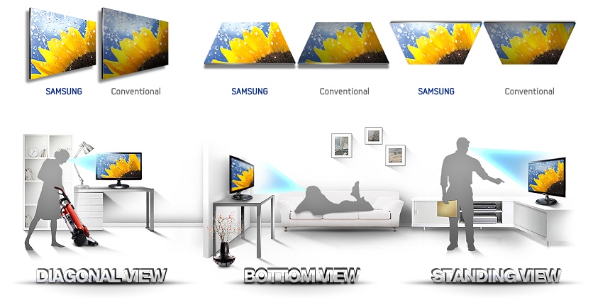 Obwohl im SyncMaster S24A350H LED wie in nahezu allen Monitoren für den Consumer-Bereich nur eine TN-Panel eingebaut ist, weist der Bildschirm in puncto Blickwinkel weniger Schwächen auf als vergleichbare Geräte. Die verbauten LEDs als Hintergrundbeleuchtung sollen darüber hinaus eine brillante Bildqualität garantieren.