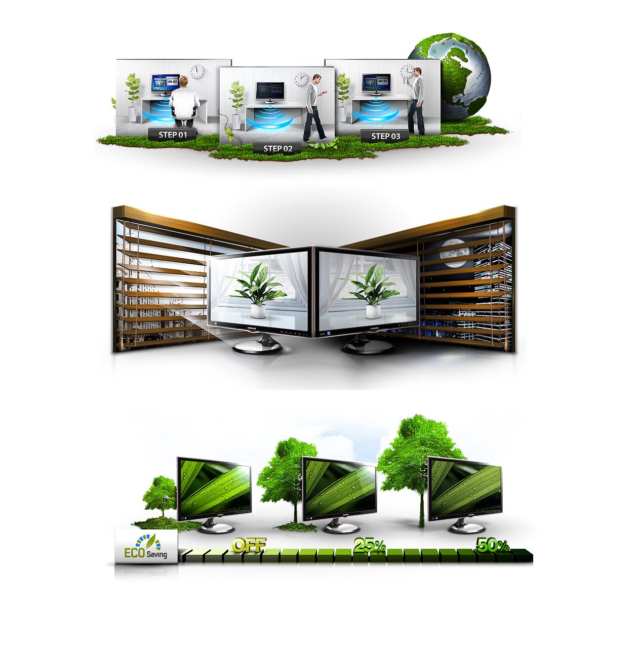 Von einem Monitor mit einer üppigen Bildschirmdiagonalen von fast 70 Zentimetern wie dem SyncMaster S27A550H LED werden viele einen der Größe entsprechenden hohen Stromverbrauch erwarten. Doch weit gefehlt. Der Monitor von Samsung zieht nicht nur lediglich 40 Watt in der Grundeinstellung aus der Steckdose. Darüber hinaus tragen gleich drei „Eco“-Funktionen dazu bei, den Stromhunger noch weiter reduzieren zu können.