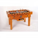 Die Produktionsstätte, aus der der Kicker stammt, steht in Spanien, die Herstellung selbst soll größtenteils in Handarbeit erfolgen. Der hauptsächlich verwendete Werkstoff Holz taucht dabei nicht nur im Korpus auf, sondern auch an Stellen, an denen man dies eigentlich kaum vermuten würde. So bestehen etwa die Griffe aus gedrechseltem Buchenholz, beim Korpus selbst kommt ausschließlich Massivholz zum Einsatz. In puncto Design sowie Verarbeitung setzt der Kicker außerdem auf die „Retro“-Karte. Der Kicker vermittle auf den ersten Blick den Eindruck, schon ein paar Jahrzehnte alt zu sein – dies berichtet jedenfalls ein (übrigens begeisterter) Besitzer des Tischs. Ins Auge fallen dabei besonders etwa die stark verzierten, massiven Vierkantfüße sowie die vernieteten Holzschutzkanten. Der komplette Tisch besitzt daher aber auch ein hohes Eigengewicht, leider bleibt das Datenblatt eine genaue Angabe darüber schuldig – es werden jedoch deutlich über 100 Kilogramm sein, so dass der Kicker vermutlich jedem noch so heftig vorgetragene Angriff mit stoischer Ruhe begegnen wird. Dies trifft auch auf die Stangen zu. Im Unterschied zu den meisten Geräten auf dem Markt handelt es sich hier nämlich um Massivstangen und keine Hohlstangen, ihr Durchmesser beträgt 16 Millimeter. Das heißt aber auch, dass sich die Figuren bei Bedarf leicht auswechseln lassen – wobei dieser Fall sehr unwahrscheinlich sein dürfte. Sie bestehen nämlich aus Aluminiumdruckguss, sind nahezu bruchsicher und von Hand bemalt. Wer möchte, kann sich die Farbe selbst aussuchen. Der Kicker wird ferner mit einem Münzwerk ausgestattet, das jedoch für den Hausgebrauch auf Dauerbetrieb umgeschaltet werden kann, damit keine Tüte voller 50-Cent-Stücke parat liegen muss.