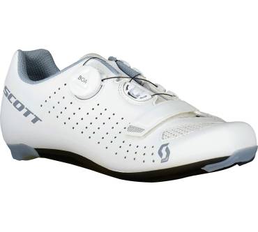 Der Road Comp Boa Lady von Scott unterstützt Rennradfahrerinnen bei der Übertragung der Beinkraft auf die Pedale. Damit es schnell aufs Rad geht, ist der Schuh mit einem Schnellschnürsystem ausgestattet, das sich an einem Drehrad auch mit einer Hand regulieren lässt. Im Vorderfußbereich sorgt ein Klettriegel für mehr Stabilität. Der Schaft besteht aus synthetischem Material und ist für ein angenehmes Innenklima mit Perforationen sowie Einsätzen aus Meshgewebe versehen. Durch eine sogenannte ErgoLogic-Wrap-Fit-Technologie soll sich das Material eng um den Fuß legen. Die Außensohle ist durch das gewählte Nylon-Glasfaser-Verbundmaterial sehr steif. Um das Fußgewölbe zu stützen und damit den Fuß zu entlasten, ist eine spezielle Innensohle integriert.
